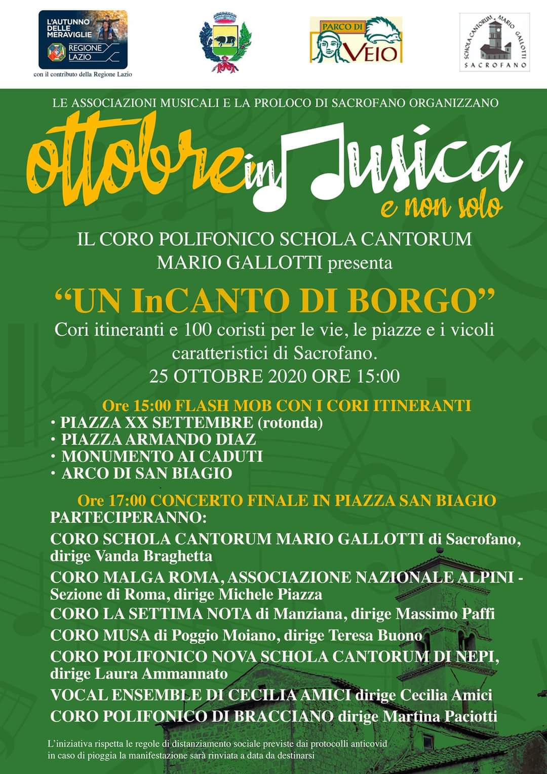 Parteciperanno: Coro Schola Cantorum “Mario Gallotti” di Sacrofano (direttore Vanda Braghetta); Coro Malga Roma – Associazione Nazionale Alpini (sezione di Roma), direttore Michele Piazza; Coro “La Settima Nota” di Manziana (RM), direttore Massimo Paffi.